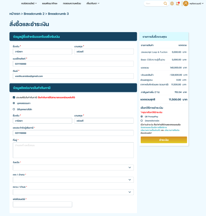 - หลังจากเลือกบทเรียนหรือสินค้า จะมาหน้าสรุปการสั่งซื้อ