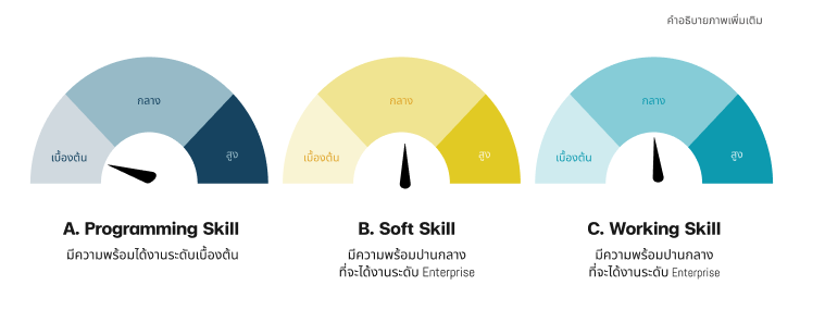 A. สรุปภาพรวมความพร้อมการได้งาน ประกอบไปด้วย 3 ทักษะ สำคัญ คือ Programming Skill / Soft Skill / Working Skill Hello