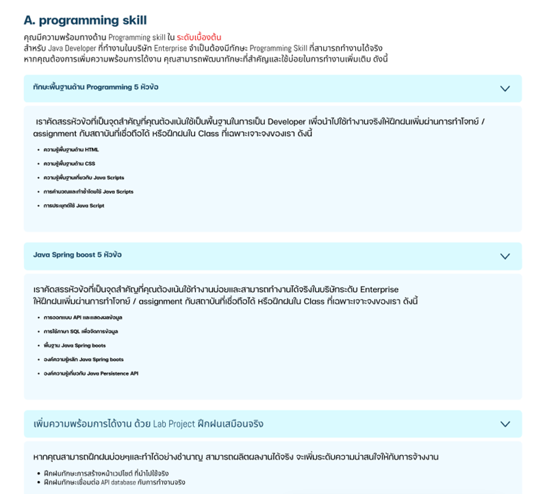 B. รายละเอียดความพร้อมการได้งานในส่วน Programming Skill พร้อมทักษะที่จำเป็นที่ต้องใช้งาน