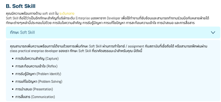 C. รายละเอียดความพร้อมการได้งานในส่วน Soft Skill พร้อมทักษะที่จำเป็นที่ต้องใช้งาน