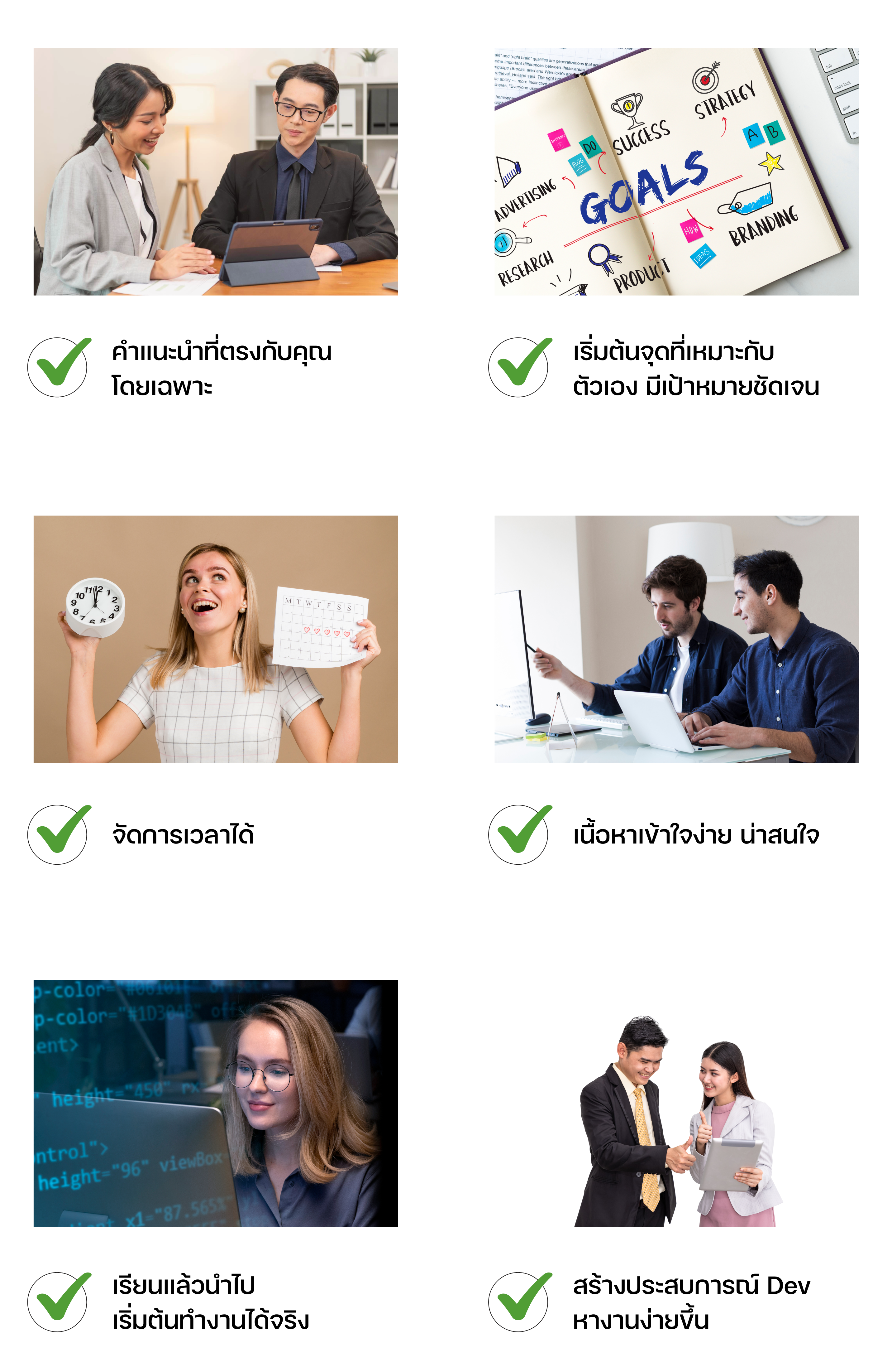 เราค้นหาจุดเริ่มต้น และคำแนะนำที่ตรงกับคุณ นำมากำหนด แผนพัฒนาทักษะที่ชัดเจนเหมาะสม