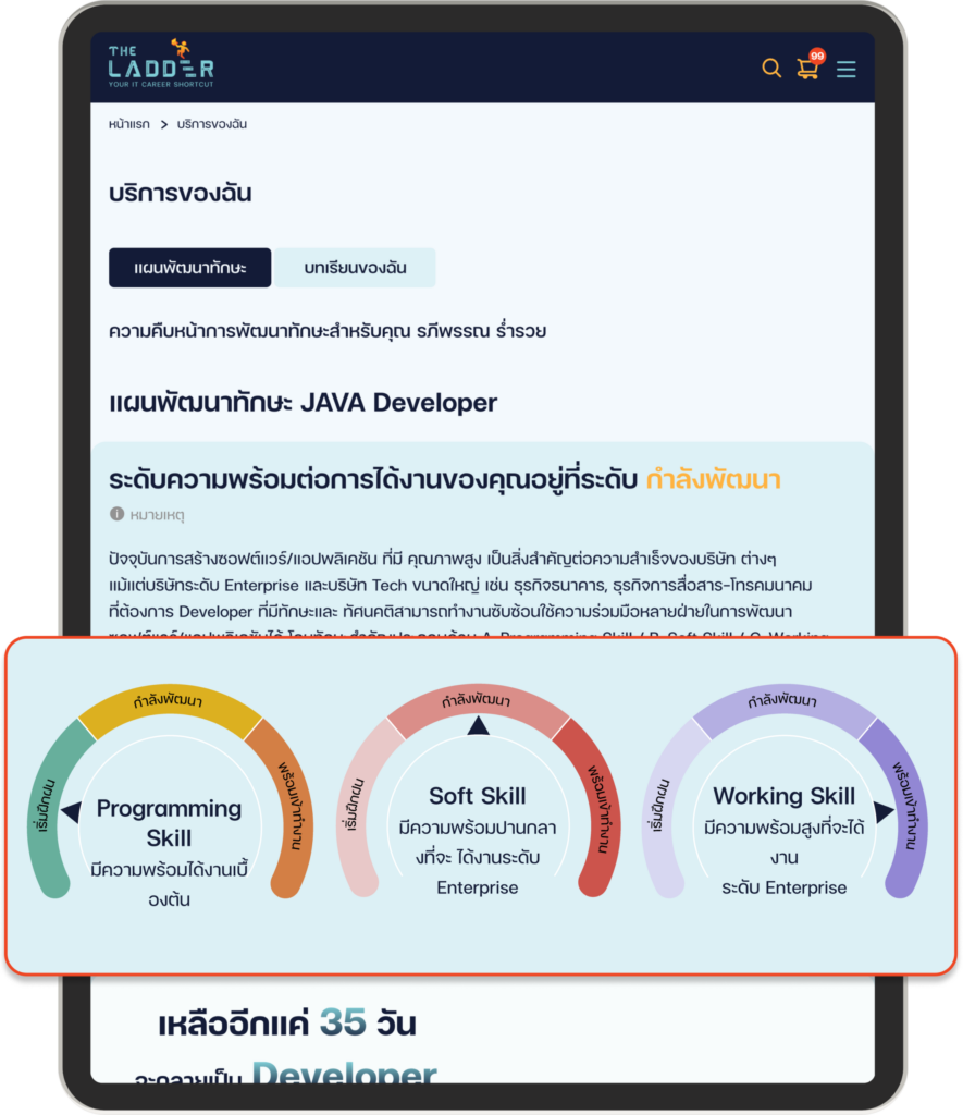 ที่ The Ladder ยังมีระบบช่วยให้นายจ้าง เข้าใจศักยภาพและระดับทักษะของคุณได้ง่ายขึ้นด้วยการเข้าถึงข้อมูลการพัฒนาทักษะของคุณ ว่ามีทักษะอะไรบ้างที่โดดเด่นจากการเข้ามาเรียนรู้ใน The Ladder