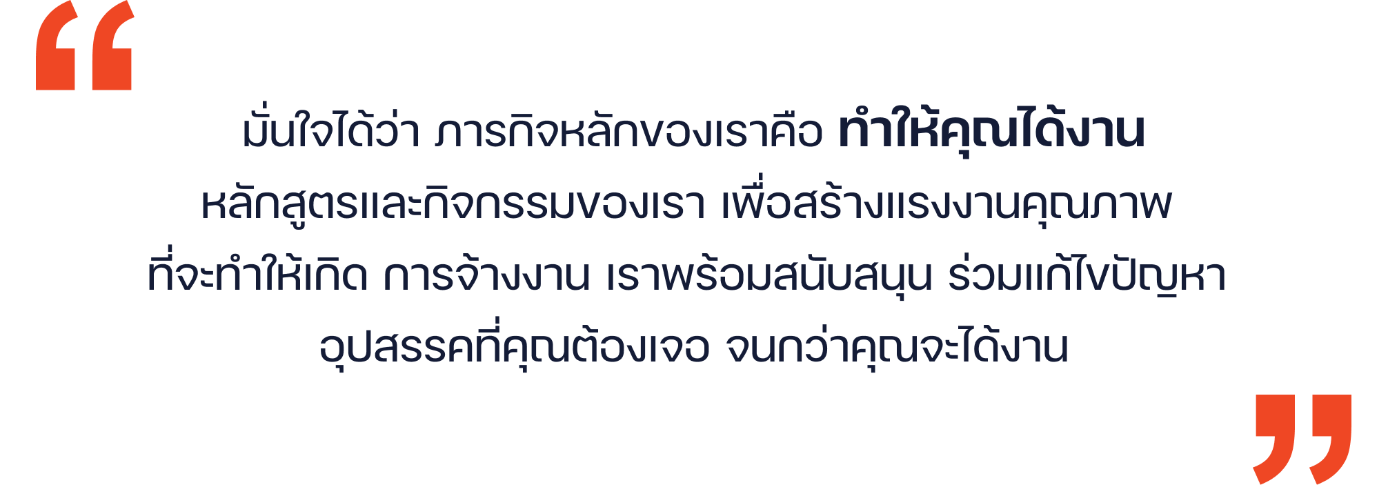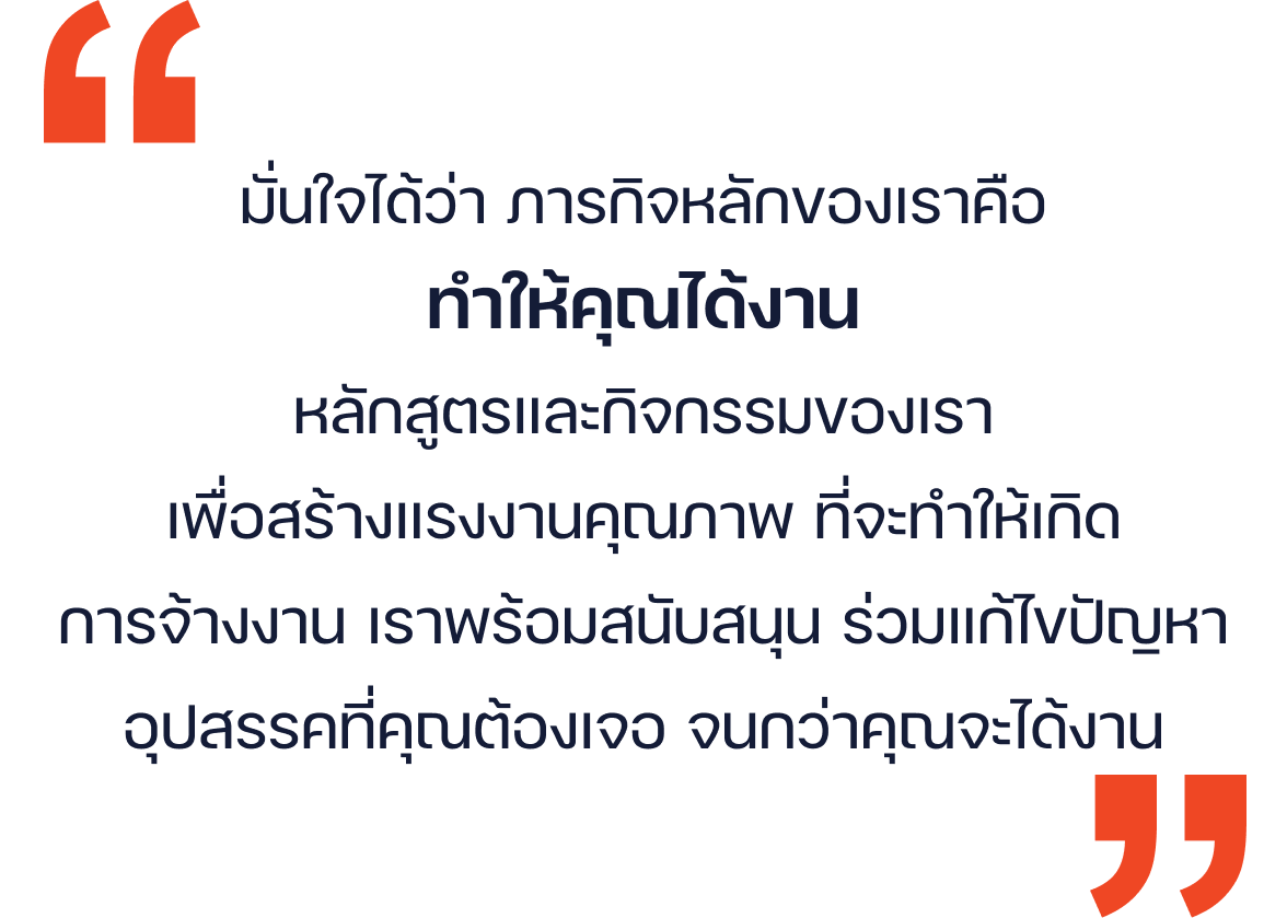 เรามุ่งมั่นนำเสนอบริการส่งเสริมการจ้างงาน ผ่านการเป็นสื่อกลาง ระหว่างนายจ้าง ลูกจ้าง และการพัฒนาทักษะ ให้สอดคล้องความต้องการ ของตลาดแรงงาน เศรษฐกิจ และเทคโนโลยีที่เปลี่ยนแปลงอยู่ตลอดเวลา